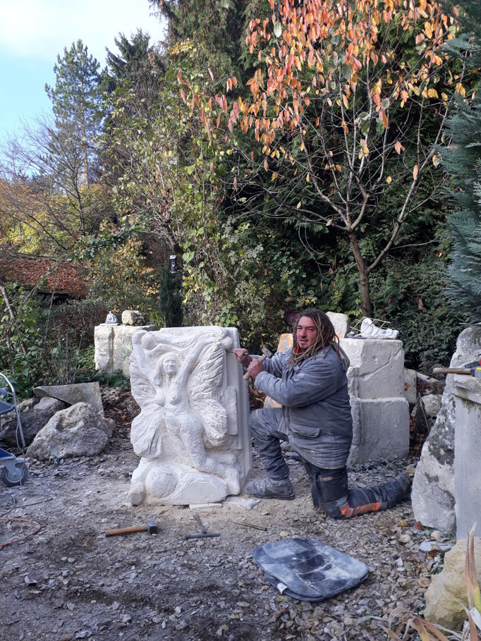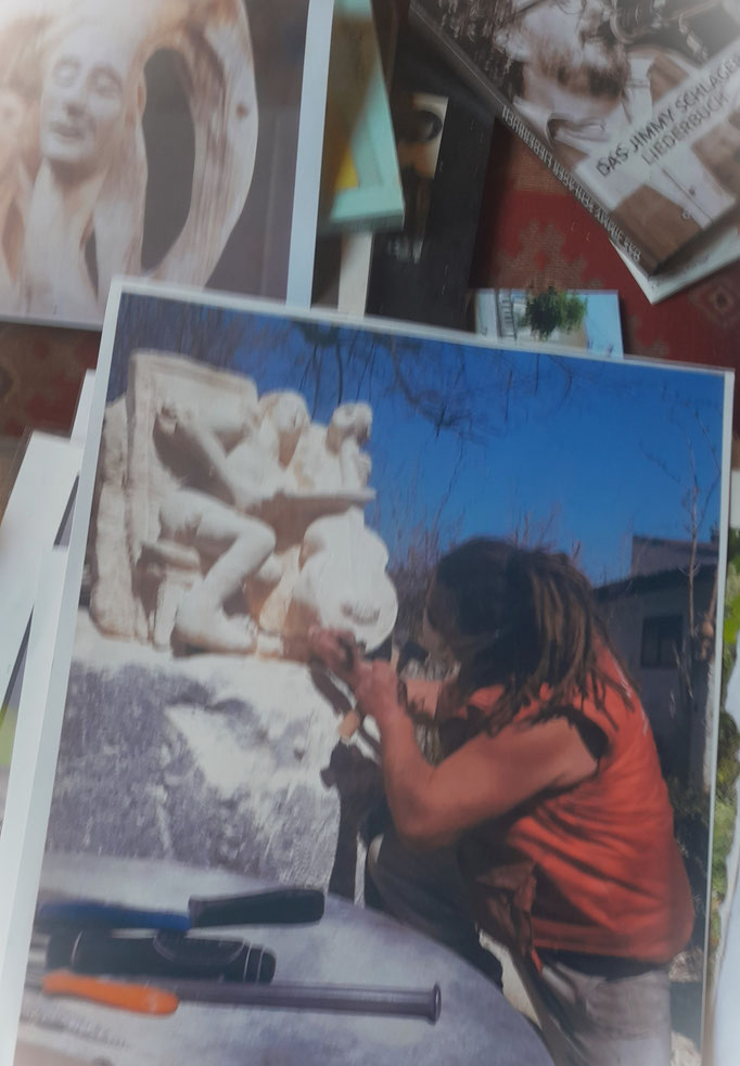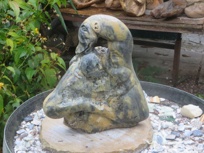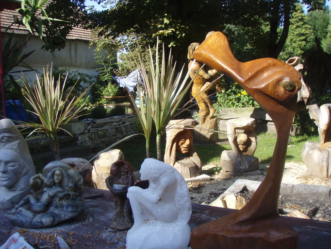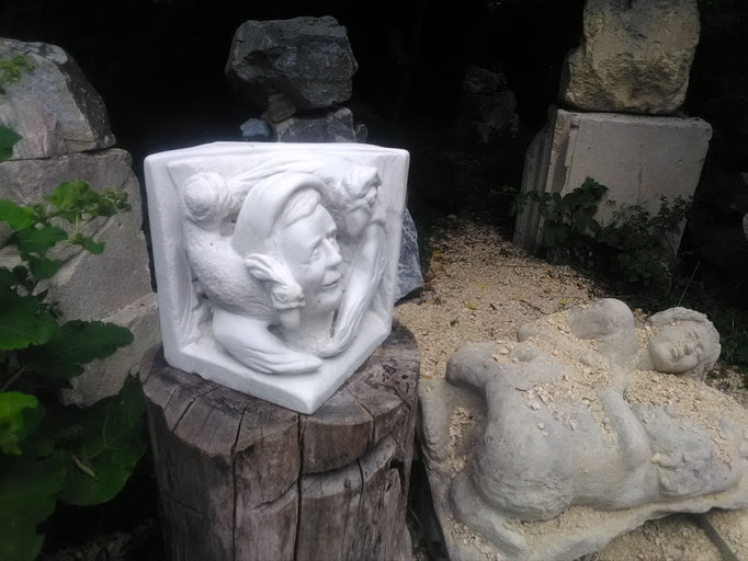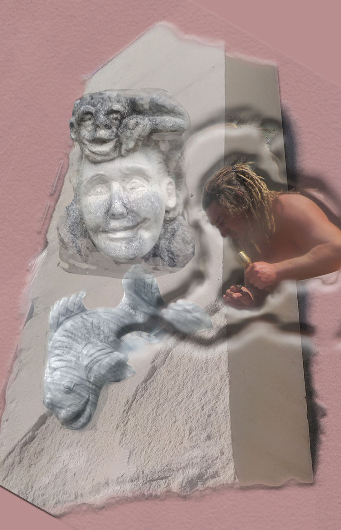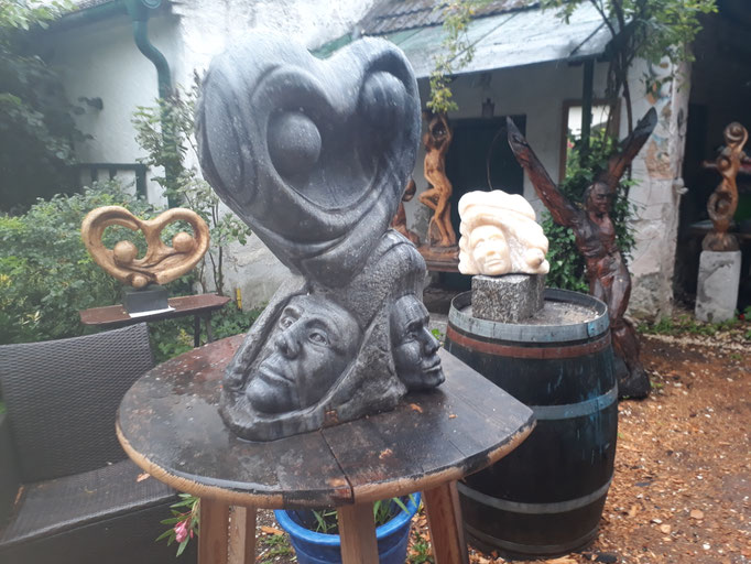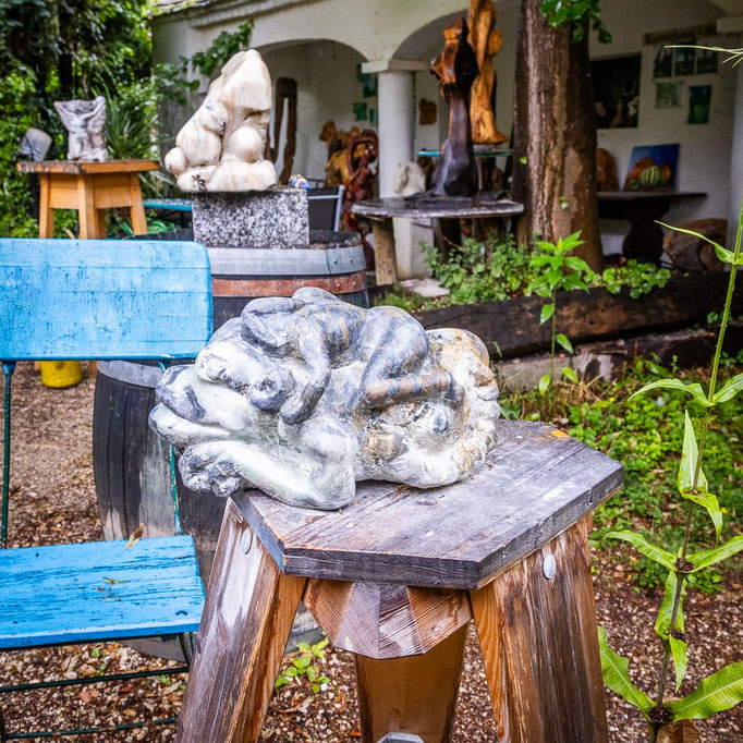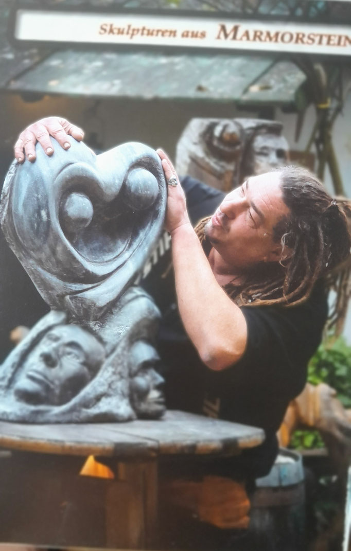 Aber harry Raab hat dieses Naturmaterial immer schon fasziniert und so begann er schon im ersten Bildhauerjahr neben Holzskulpturen auch Speckstein und Alabaster zu behauen. Mittlerweile hat er auch Marmor-, Kalkstein, - und Sandsteinskulpturen erschaffen. Immer unter der Prämisse, mit möglichst wenig Maschineneinsatz zu arbeiten. Schlag um Schlag mit Eisenmeisseln und Bildhauerklöppel, Schleifen und Glätten mit Spezialfeilen und Schleifpapieren.Eine faszinierende Schwerarbeit,bei der man das steinharte Naturmaterial erfühlen und bewundern darf.